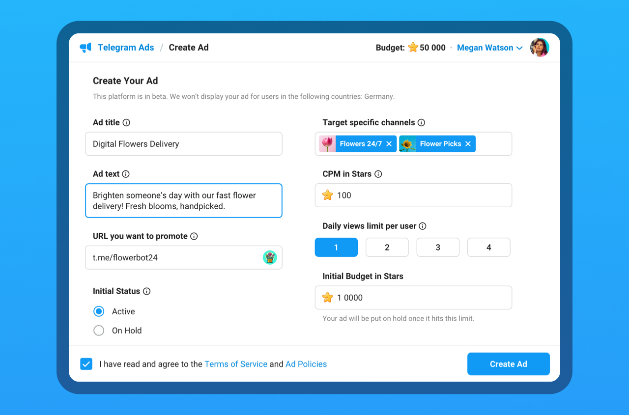 Anyone can place privacy-conscious ads in public Telegram channels to promote their bot, channel or group.