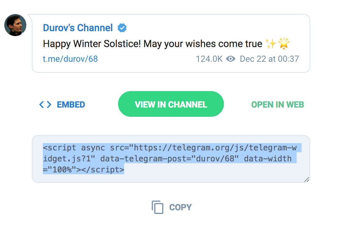 Telegram 4.6, released earlier this month, introduced new granular settings for auto-downloading media, better link previews, albums in Secret Chats, improved security, and embeds for messages from public groups and channels. Here’s what an embed of a Telegram message looks like when included on a web page: